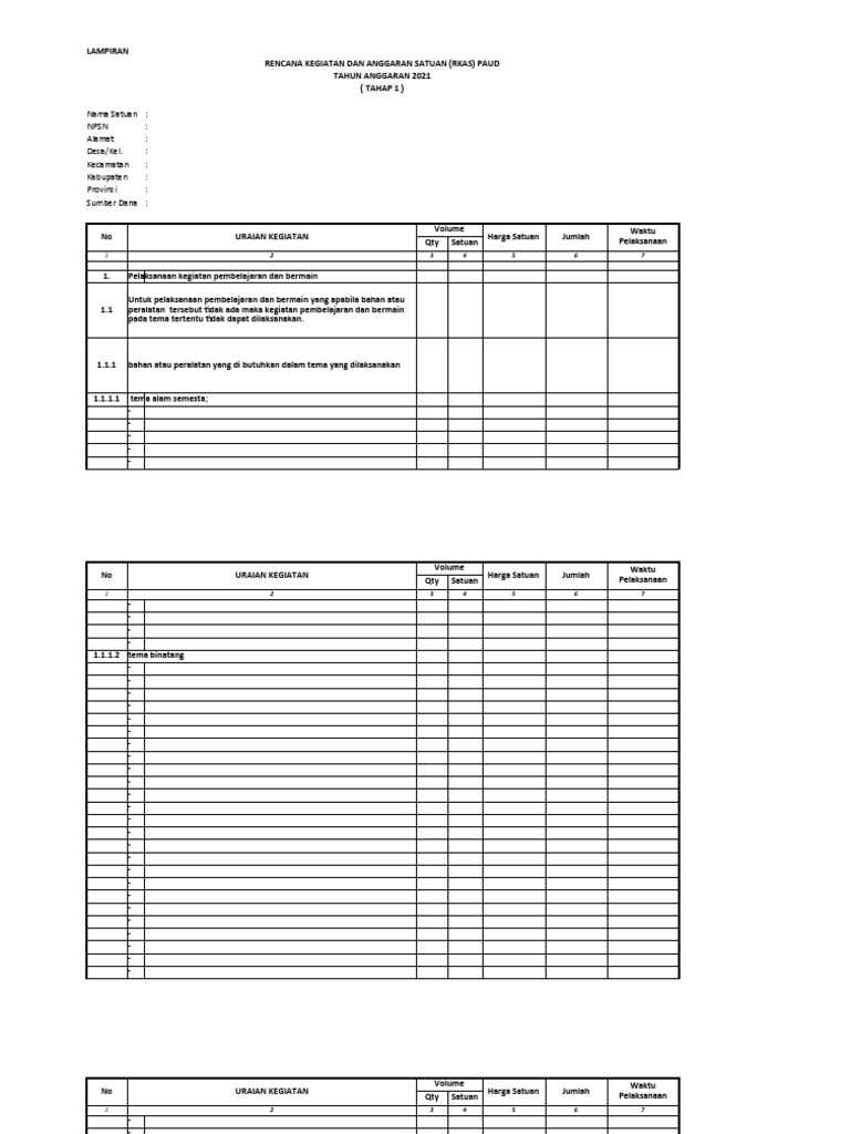 Mohon maaf atas segala kekurangan kami dalam menjelaskan materi. Soal pas sem 1 matematika kelas 6 sd k13 rev 2019. Word yang sangat mudah untuk dioperasikan. Petunjuk teknis bop paud tercantum dalam peremndikbud no 9 tahun 2021 sebagai pedoman dalam pengelolaan dana bantuan operasional penyelenggaraan seperti yang tercantum dalam juknis bop paud bahwasannya yang dimaksud dengan penyelenggaraan paud adalah sebuah lembaga satuan. Contoh format lampiran sarana prasarana bop paud khusus non fisik. Setiap guru paud baik pada jenjang kb, tk, sps, tpa mempunyai. Dak nonfisik bop paud merupakan bagian integral yang tidak terpisahkan dari rencana kegiatan dan anggaran satuan (rkas). Contoh format rkas bop paud/tk sesuai juknis penggunaan dana alokasi khusus nonfisik bop paud, rkas tk terbaru. Format tersebut yaitu lpj bop paud tahap 1 dan 2 tahun anggaran 2019/2020 dalam format ms. Belanja bantuan operasional penyelenggaraan (bop) paud telah digunakan dalam rangka mendukung operasional paud dan tidak untuk keperluan pribadi. Dan ingat bahwa materi ini dapat diedit dan disesuaikan dengan situasi dan kondisi yang ada di lingkungan bapak/ibu semuanya. Penyusunan rkas bop paud itu mudah (bop paud tahun 2021 kecamatan kasembon kabupaten malang). Semoga bermanfaat untuk semuanya dan untuk pormat rkas dan lainnya.